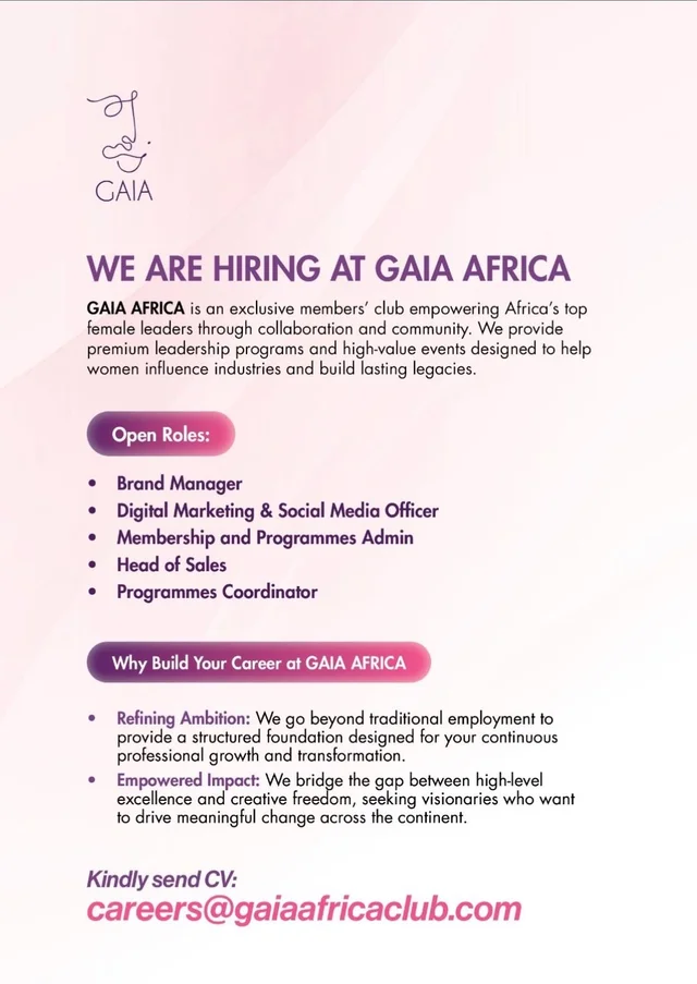 GAIA AFRICA is currently hiring across multiple roles, offering professionals the opportunity to be part of a high-impact organization focused on empowering Africa’s top female leaders through collaboration, community, and transformative leadership experiences.