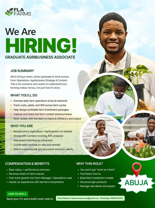 FLA Farms is hiring a Graduate Agribusiness Associate for a hands-on, high-impact role designed for smart, driven graduates who want to understand the business side of agriculture, not just farming, but how farming makes money.