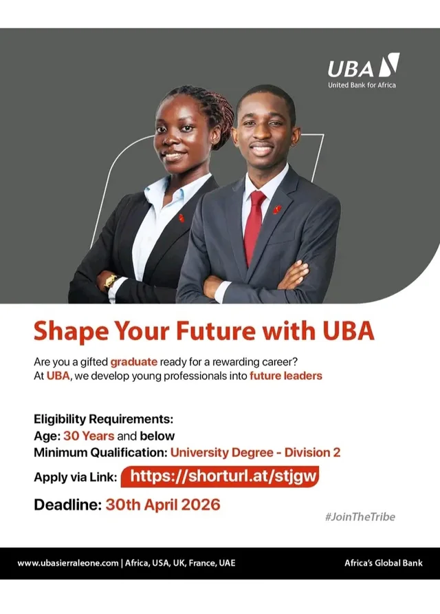 Open to candidates across all African countries where UBA operates Deadline: 30th April 2026 Apply hereAttractive entry-level compensation package Location Open to candidates across all African countries where UBA operates Deadline: 30th April 2026 Apply herePosted April 27, 2026